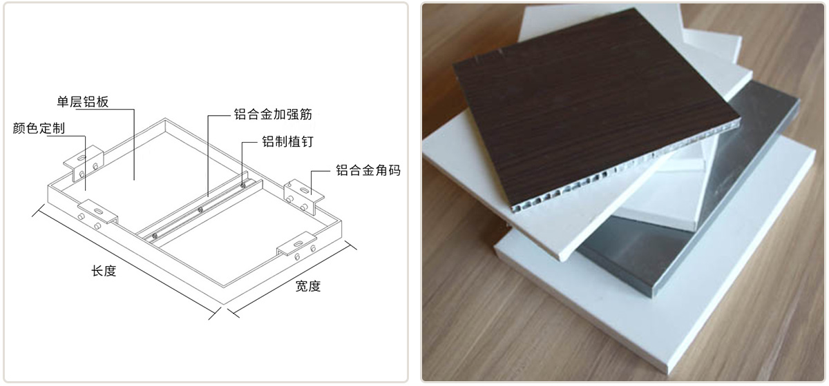 铝单板采用优质高强度铝合金板材,主要由面板、加强筋和角码组成。加强筋与面板后的电焊螺丝钉连接,使之成为一个牢固的整体,极大增强铝单板幕墙的强度和刚性, 保证了长期使用中的平整性与抗震能力。