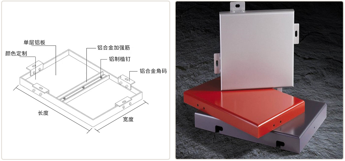 铝单板采用优质高强度铝合金板材,主要由面板、加强筋和角码组成。加强筋与面板后的电焊螺丝钉连接,使之成为一个牢固的整体,大大增强铝单板幕墙的强度和刚性, 保证了长期使用中的平整性与抗震能力。