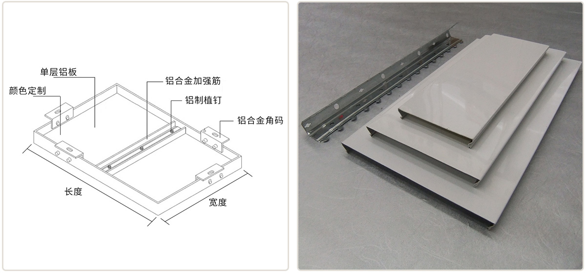 铝单板采用优质高强度铝合金板材,主要由面板、加强筋和角码组成。加强筋与面板后的电焊螺丝钉连接,使之成为一个牢固的整体,极大增强铝单板幕墙的强度和刚性, 保证了长期使用中的平整性与抗震能力。